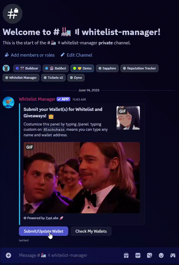 /customize_bot_appearance Change bot nickname and embed footer. Premium OnlyExample Setup/setup adminrole:@Admin channel:#wallets submittedrole:@Wallet Submitted whitelistrole:@Whitelist