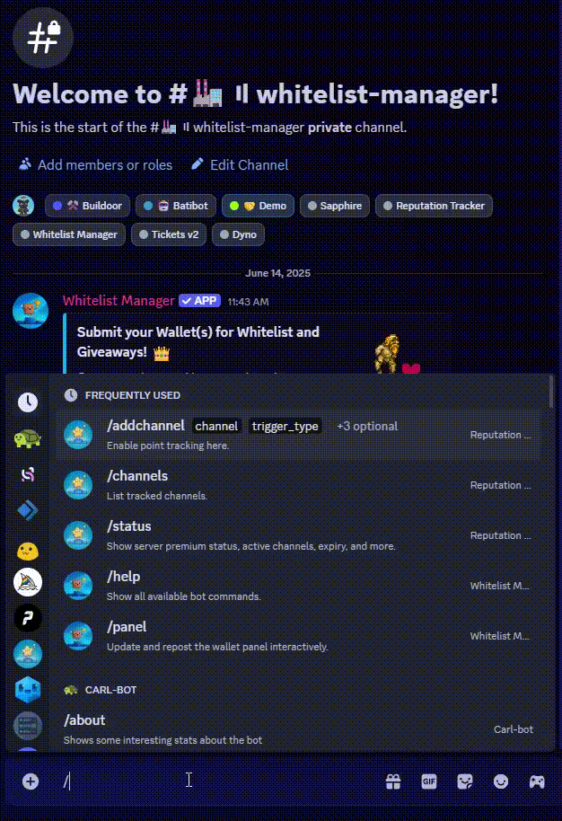 - Slash Commands: All bot functions are available via Discord’s / commands menu.User Commands/wallet Add, update, remove, or list your wallets